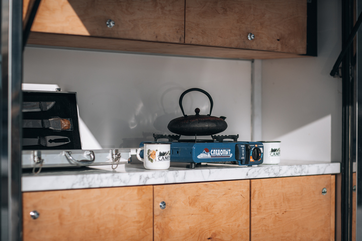 Кухонный модуль располагается в задней части кемпера, он полностью изолирован и герметичен. Предусмотрена отдельная дверь, она закрывается Т-замками с обеих сторон.
